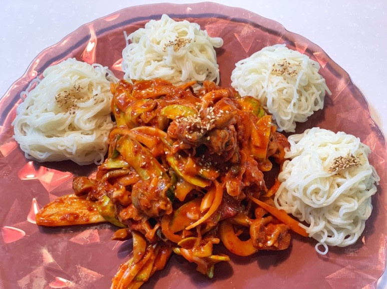Ahora, preparemos las verduras. Lava bien el pepino y córtalo en juliana fina. Corta la cebolla en juliana fina también. Pica finamente los chiles coreanos después de quitarles las semillas. (¡Si te gusta más picante, puedes dejar las semillas!). Escurre los caracoles marinos enlatados y córtalos en trozos del tamaño de un bocado. Si son demasiado grandes, córtalos por la mitad o en cuartos. ¡Consejo! Mientras preparas los otros ingredientes, puedes hervir los fideos Somen con antelación y enjuagarlos bajo agua fría para escurrirlos, lo que te ahorrará tiempo.
