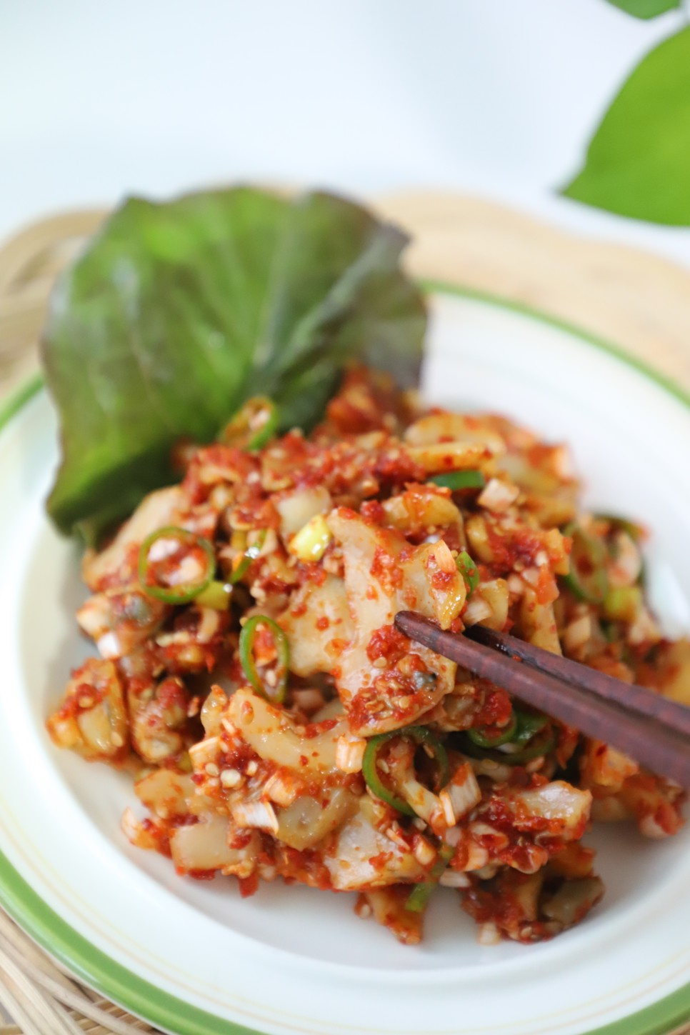 Presentamos una receta para una ensalada de sora-jeot deliciosamente crujiente, perfecta como un plato especial cuando buscas algo único. Sazonada para ser picante y dulce sin ningún olor a pescado, es un acompañamiento sofisticado que también constituye una opción saludable. Si hacer sora-jeot desde cero es difícil, usar productos comprados en tienda también es una excelente alternativa.