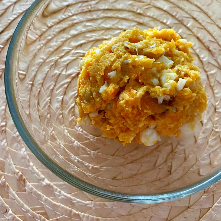 Con cuidado, pela las batatas y los huevos cocidos. Es más fácil pelarlos mientras aún están tibios.