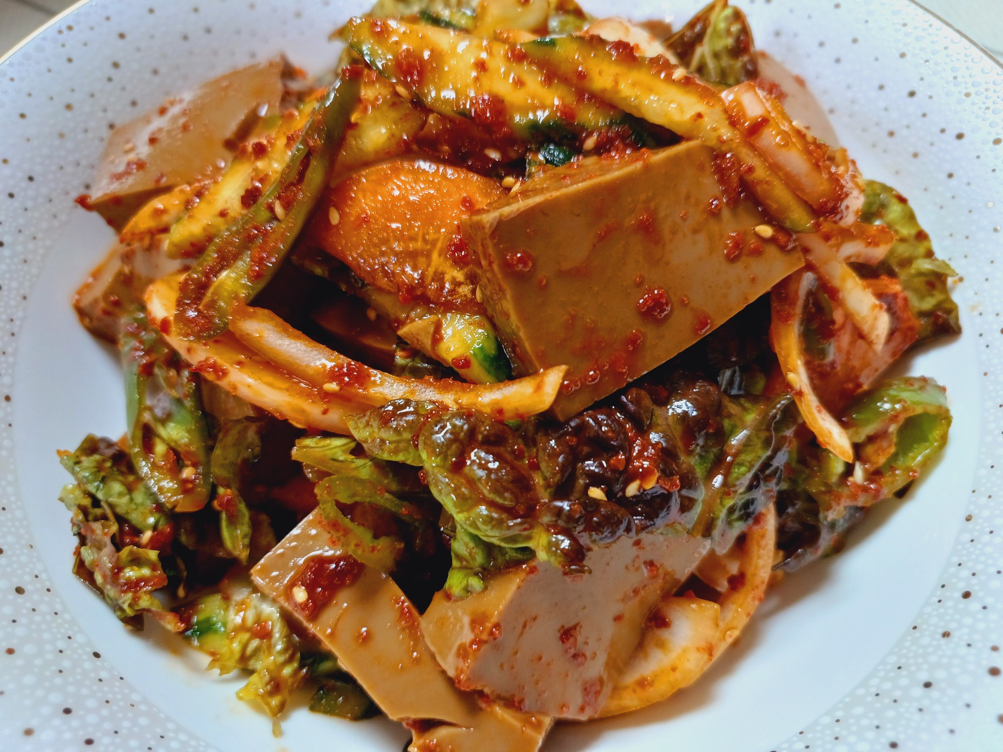 ¡Voilà! Su refrescante ensalada de gelatina de bellota está completa. La deliciosa elasticidad de la muk combinada con el satisfactorio crujido de las verduras frescas crea un plato verdaderamente exquisito. Su perfil de sabor dulce, salado y ligeramente picante garantiza que despertará su apetito, y sus vibrantes colores añadirán un hermoso toque a su mesa. Es el acompañamiento perfecto para un makgeolli frío – ¡pruébelo!