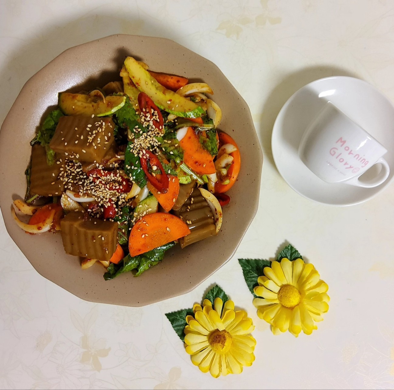¡Su deliciosa y masticable ensalada de gelatina de bellota está lista! Disfrute de este plato exquisito que equilibra perfectamente la textura de la gelatina de bellota con el crujido de las verduras frescas. Es un acompañamiento fantástico, especialmente perfecto cuando se marida con una copa de makgeolli (vino de arroz coreano).