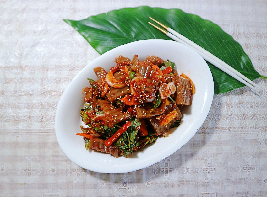 Mientras que los cuencos de gelatina de bellota son refrescantes en verano, esta ensalada picante y sabrosa es un excelente acompañamiento que complementa cualquier comida. Es la elección perfecta cuando necesitas un impulso para tu apetito.