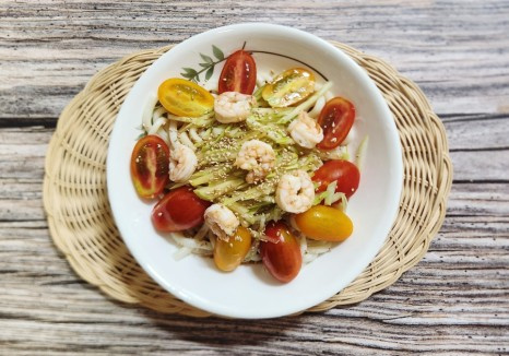 Disfruta de esta deliciosa ensalada de udon frío, donde la vibrante salsa Cham-Gan-Cho complementa perfectamente los fideos, las verduras frescas y los camarones. Es una comida ligera y refrescante ideal para los calurosos días de verano.