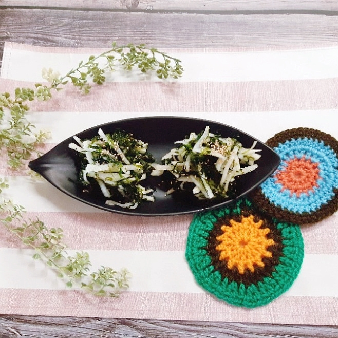 Primero, prepara un paquete de algas marinas. Lava bien el rábano (aproximadamente 1/4 de un rábano mediano) bajo el chorro de agua. Para limpiar eficazmente las algas marinas, añade un puñado de sal gruesa al agua; esto ayuda a eliminar las impurezas. Corta el rábano en juliana fina.