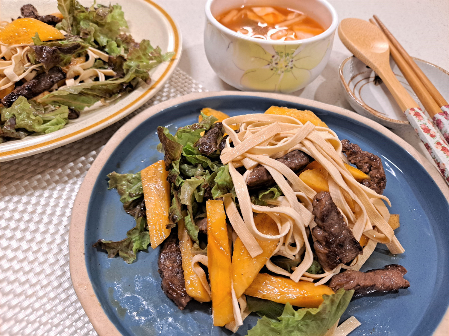 Ahora todos los componentes para nuestra hermosa ensalada están listos. Tenemos los delicados fideos de tofu, la sabrosa carne de res a la parrilla, el dulce caqui y las verduras frescas.
