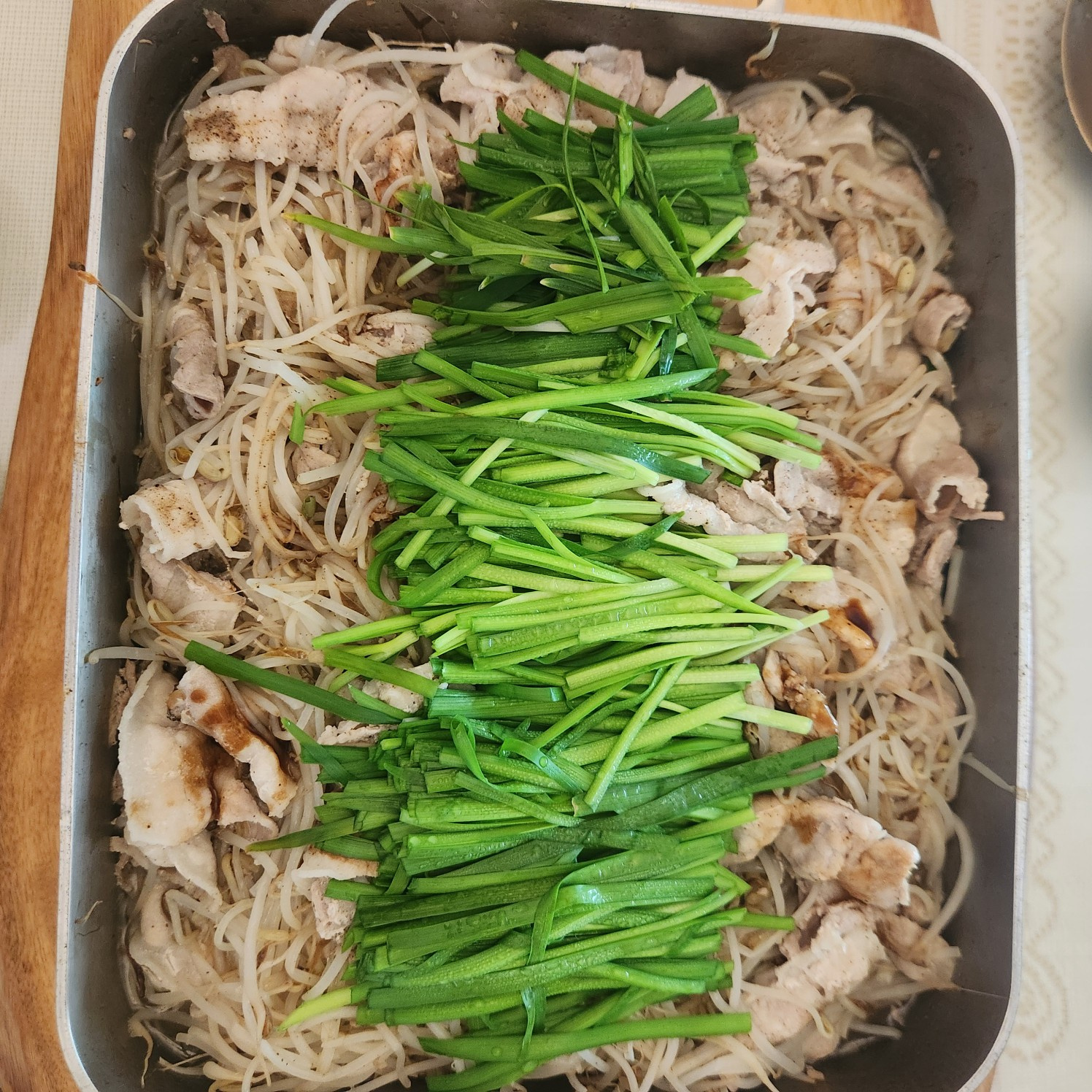 Ahora, prepare su olla para cocinar al vapor. Coloque una capa generosa de los brotes de soja escurridos en el fondo de la olla. Disponga las rodajas de panceta de cerdo sobre los brotes. Espolvoree el ajo picado y el vino de cocina de manera uniforme sobre la panceta. Puede repetir este proceso de capas 2-3 veces para asegurar una cocción uniforme. Termine cubriendo con otra capa de brotes de soja.