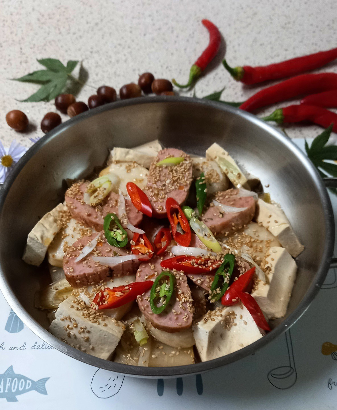 Coloque cuidadosamente el jamón deli y el tofu cortados alrededor de la olla. Agregue 1 cucharadita de ajo picado en el centro para darle más sabor y vierta 200 ml de agua.