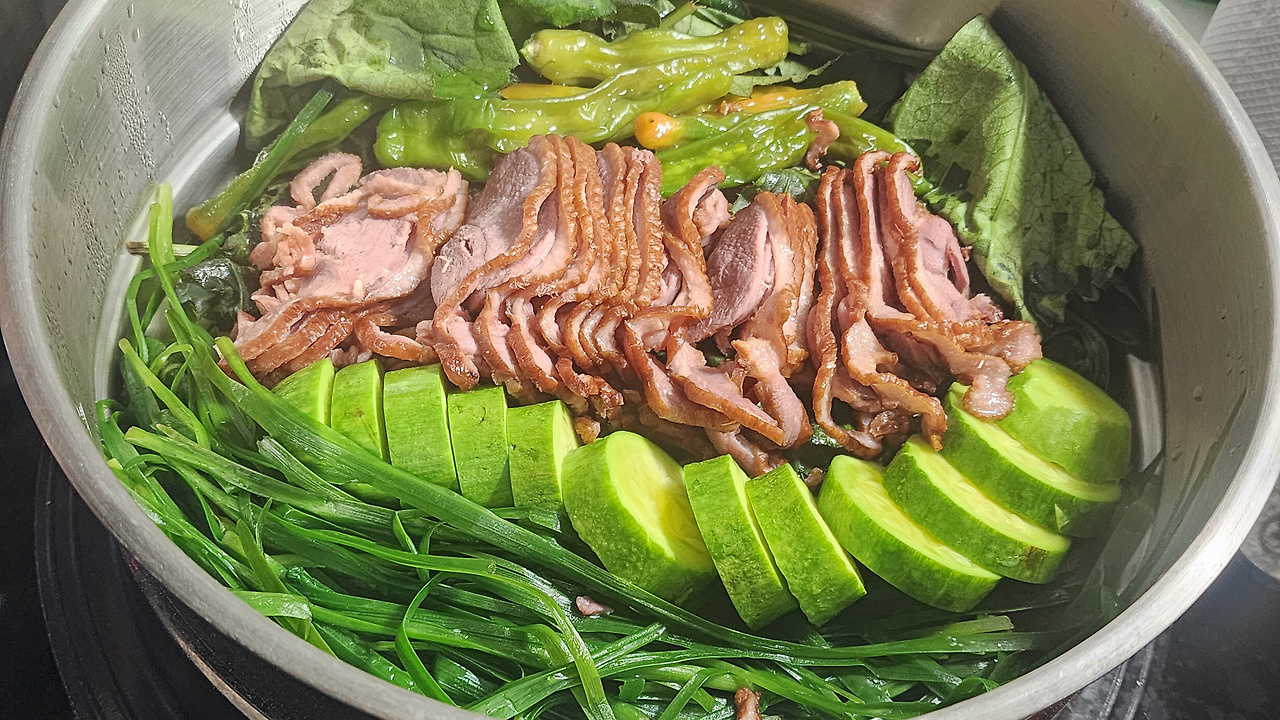 Tapa la vaporera y cocina al vapor a fuego alto durante unos 10-15 minutos. Cocina hasta que las verduras estén tiernas y el pato ahumado haya infusionado su sabor en ellas. La grasa del pato se escurrirá y sazonará maravillosamente las verduras.