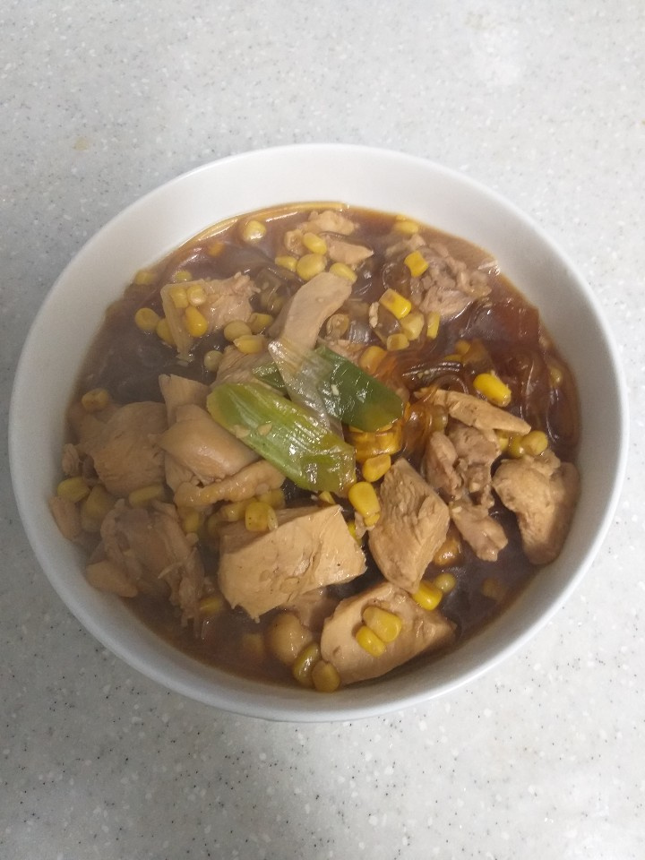 Prepara los ingredientes principales: 3 muslos de pollo deshuesados y 1 pechuga de pollo. Ten también un puñado de fideos de cristal para una textura masticable y 1/2 taza de maíz en lata para un toque de dulzura.