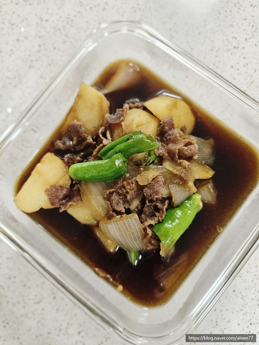 ¡Una combinación celestial de patatas esponjosas y tierna ternera estilo bulgogi! Este guiso, con su sabor profundo, salado y ligeramente dulce, se asemeja a un sabroso jangjorim (carne estofada en salsa de soja), convirtiéndose en el acompañamiento perfecto que te hará devorar una ración de arroz sin darte cuenta. ¡Disfruta de este plato casero irresistiblemente delicioso!
