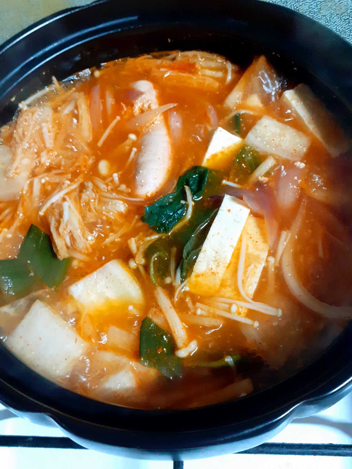 Vierte 360 ml (aproximadamente 1.5 tazas) de agua en una olla. Añade aproximadamente 1 cucharada de la pasta de condimento preparada (gochujang, azúcar, oligosacárido/miel, salsa de soja). Es una buena idea empezar con una cantidad menor de condimento y añadir más a medida que el estofado hierve a fuego lento. Usar caldo de anchoas y algas en lugar de agua creará un sabor aún más rico.