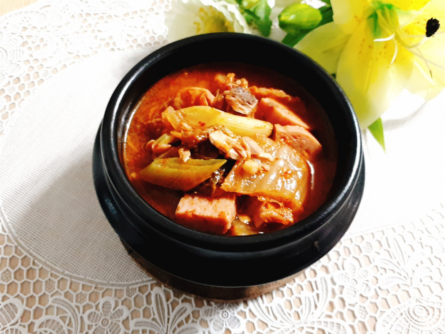 Este estofado de kimchi, preparado con kimchi bien fermentado, Spam salado y atún lleno de sabor, es increíblemente fácil de hacer y tiene un gusto fantástico. Es un plato sencillo pero sustancioso que toda la familia puede disfrutar.