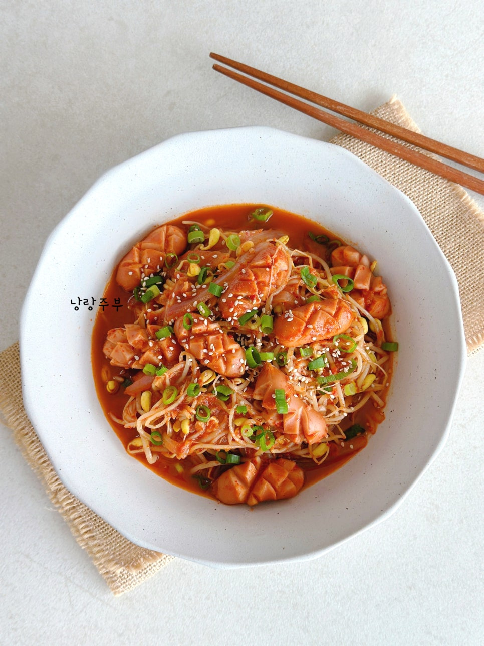 Para este plato, las salchichas vienesas, los brotes de soja, la cebolla y las cebolletas son suficientes para crear una comida deliciosa. Si prefieren un toque más picante, ¡no duden en añadir 1-2 chiles Cheongyang (pimientos picantes coreanos) picados a la mezcla!