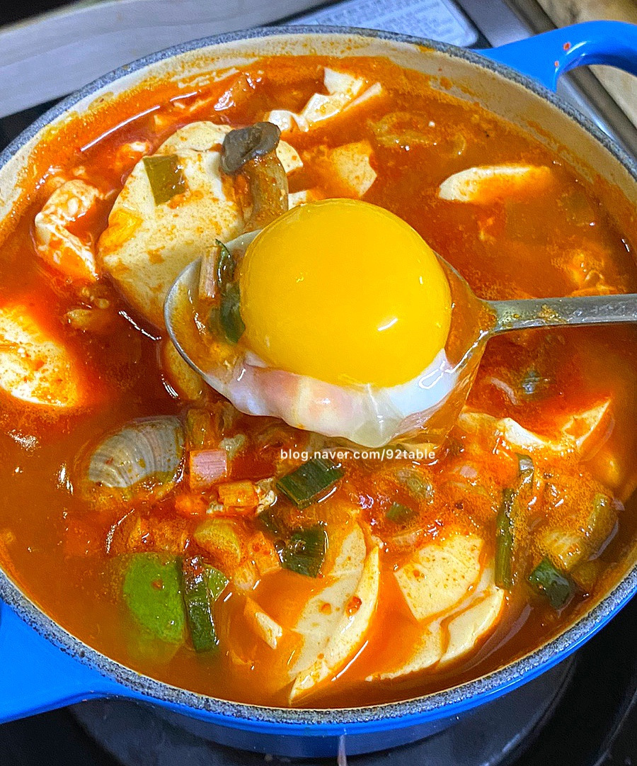 Cuando el estofado vuelva a hervir vigorosamente, reduce el fuego a bajo. Rompe el huevo directamente en el estofado. Añade el chile picante picado (si lo usas) y la cebolleta restante. Cocina a fuego lento durante aproximadamente un minuto más. ¡Tu delicioso y picante estofado de tofu blando con almejas está listo! Disfruta.