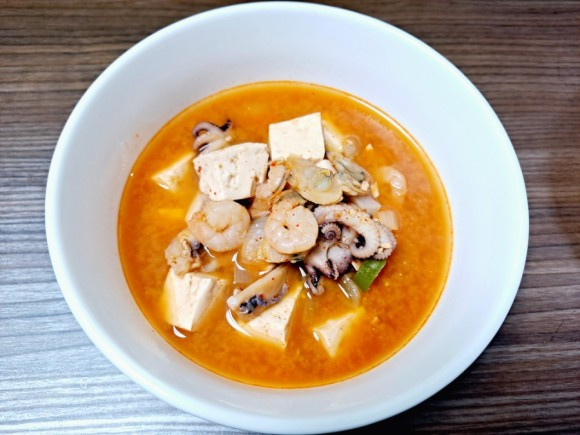 He preparado doenjang jjigae de mariscos utilizando una mezcla de mariscos congelados. ¡Añadir la mezcla de mariscos hizo que el doenjang jjigae se sintiera refrescante e incluso un poco picante!
