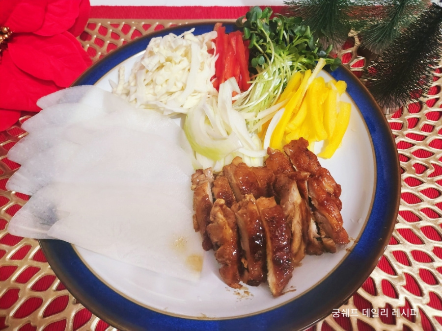 A continuación, prepare las verduras. Lave la media cebolla, el pimiento amarillo y el pimiento rojo, retíreles las semillas y córtelos en juliana fina, perfectos para acompañar el bistec de muslo de pollo. Corte finamente en juliana 60g de repollo para añadir un toque crujiente. Una vez preparadas estas verduras, habrá completado la preparación de los ingredientes, similar a hacer una ensalada fresca.