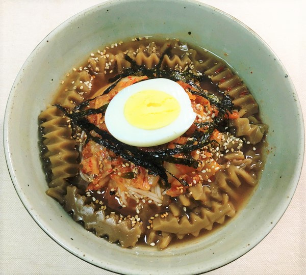 Arma tu Kimchi Mari Guksu colocando los fideos escurridos en un tazón grande. Cubre con el kimchi sazonado, la gelatina de bellota escaldada, la mitad del huevo duro y una pizca de escamas de alga marina tostada. ¡Disfruta de tu refrescante y deliciosa comida! (Consejo: Aunque el kimchi solo es delicioso, agregar gelatina de bellota hace que este plato sea más sustancioso y una comida completa y nutritiva.)
