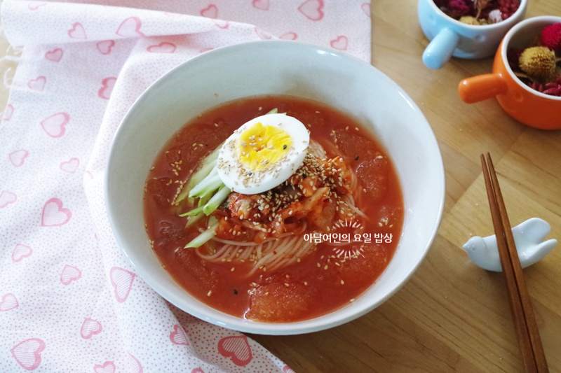 Tenía kimchi perfectamente fermentado en casa, ¡tan delicioso que no podía desperdiciar ni su jugo! Normalmente lo mezclo con arroz, pero esta vez, decidí hacer Kimchi Mari Guksu usando un poco de caldo de dongchimi congelado de mi congelador. Con el caldo helado, el sabor refrescantemente agridulce fue absolutamente delicioso, y terminé todo el cuenco en un instante. ¡Es el plato perfecto para disfrutar en un caluroso día de verano!