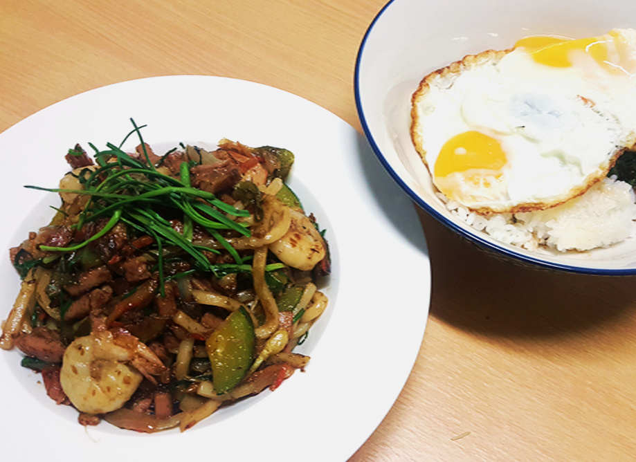 3. ¡Un festín para la vista y el paladar! Presentación: Coloquen el arroz cremoso en un tazón para servir. Coronen con el huevo frito perfectamente cocido. ¡Todas las preparaciones están completas! ¡Disfruten de sus deliciosos fideos udon salteados con cebolletas silvestres y del increíblemente sabroso arroz cremoso con mantequilla y salsa de cebolletas silvestres!