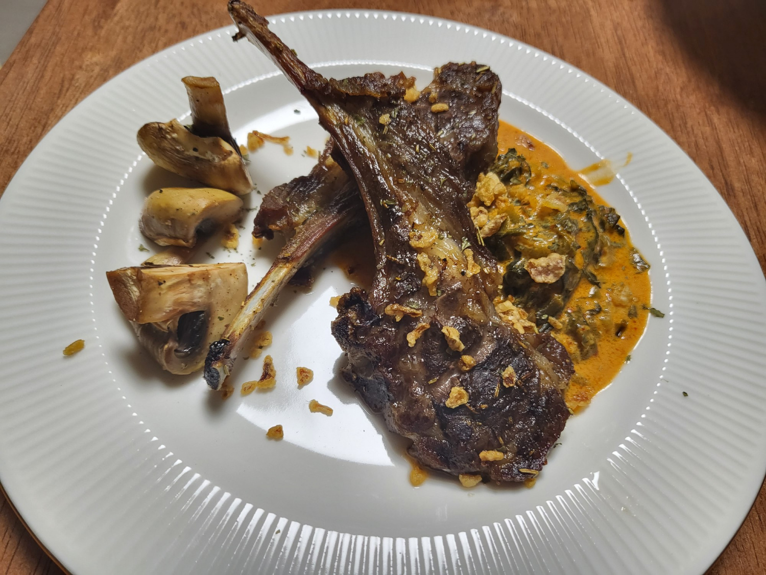 Coloque los filetes de lomo de cordero calientes de manera atractiva en un plato para servir. Sirva generosamente la salsa cremosa de kimchi caliente sobre los filetes. Añada los champiñones salteados como guarnición colorida. La exquisita combinación de la salsa cremosa de kimchi y el tierno filete de lomo de cordero creará una experiencia culinaria inolvidable. ¡Disfrute de su deliciosa comida!