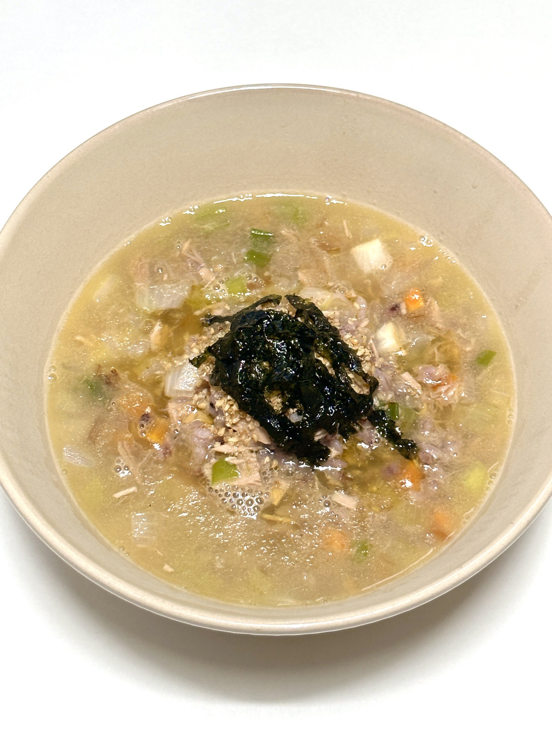 Sirve las gachas calientes en cuencos individuales. Decora generosamente con semillas de sésamo y copos de alga nori. Si lo deseas, puedes rociar un poco más de aceite de sésamo por encima para darle un toque extra de sabor. ¡Disfruta de estas gachas de atún y verduras reconfortantes y saciantes que dejarán tu estómago contento y tranquilo!