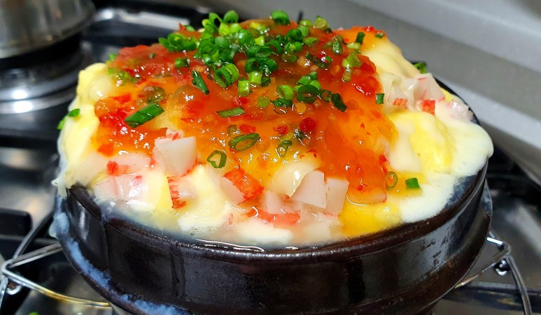 Cuando la gachuela de huevo esté aproximadamente un 80% hecha, esparce uniformemente el cangrejo picado y 2-3 cucharadas de queso mozzarella por encima. Luego, tapa la olla con un bol convexo o una tapa y deja cocinar al vapor durante unos 2 minutos. Este paso ayuda a que el queso se derrita y suba, creando el aspecto de ‘explosión volcánica’.