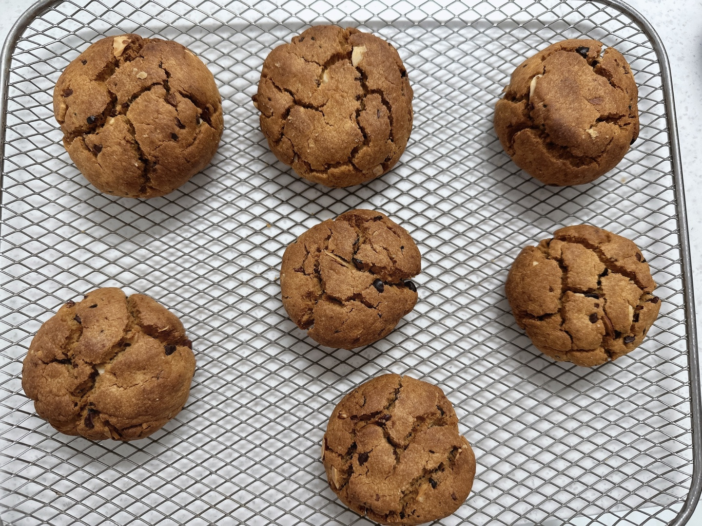 Precalienta tu horno a 180°C (350°F). Toma porciones de masa y forma bolitas, colocándolas en una bandeja para hornear forrada con papel pergamino, dejando espacio entre cada galleta. Hornea durante aproximadamente 15 minutos, o hasta que los bordes estén dorados y los centros firmes. Deja enfriar las galletas en la bandeja durante unos minutos antes de transferirlas a una rejilla para que se enfríen por completo.