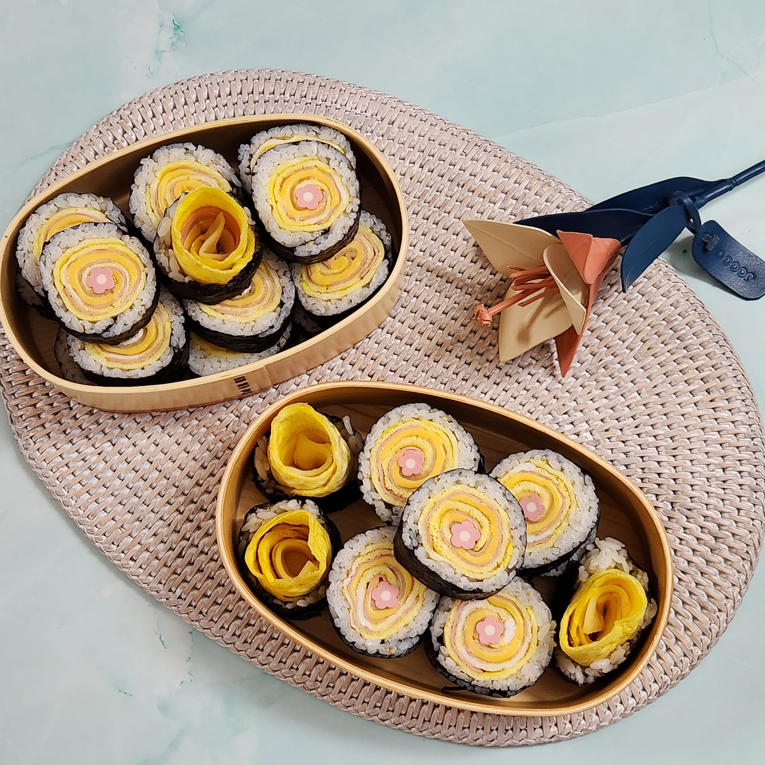 El gimbap terminado de huevo enrollado con jamón y queso es un verdadero favorito entre los niños. ¡Los colores vibrantes y los rellenos generosos lo convierten en una opción ideal para loncheras en ocasiones especiales o como una deliciosa merienda.