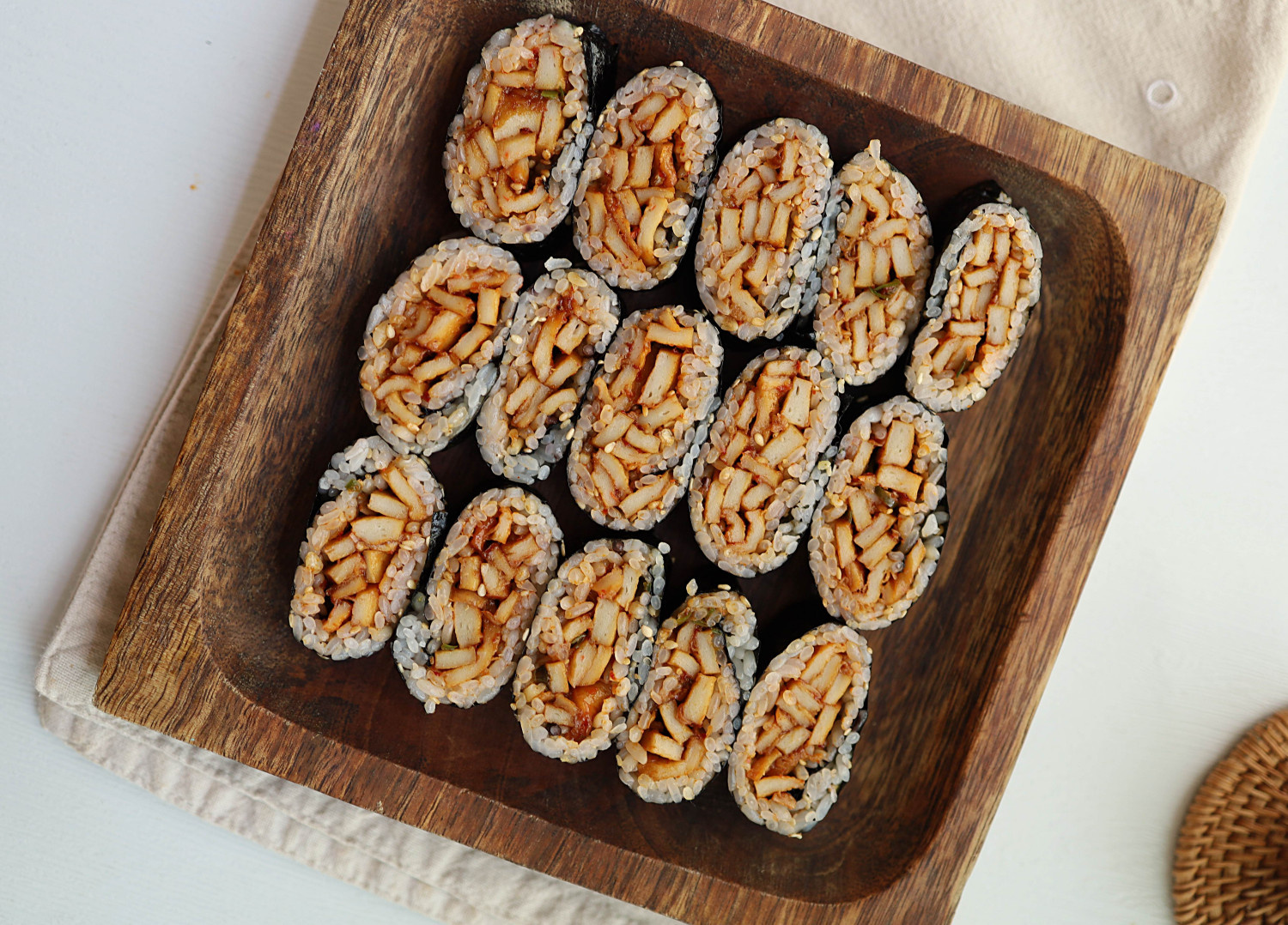 Este ‘Gimbap Plegado de Pastel de Pescado Picante’ es una deliciosa alternativa al gimbap tradicional. El pastel de pescado salteado y picante se utiliza para crear un gimbap plegado maravillosamente simple que seguramente reavivará su apetito, ¡incluso si se había desvanecido!