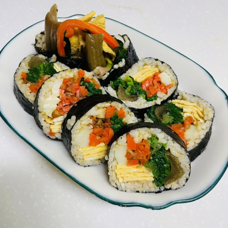 Coloca el gimbap cortado de forma atractiva en un plato. ¡Tu gimbap saludable y delicioso, hecho con verduras de primavera de temporada y kimchi de mostaza, está listo! Disfruta tu comida.