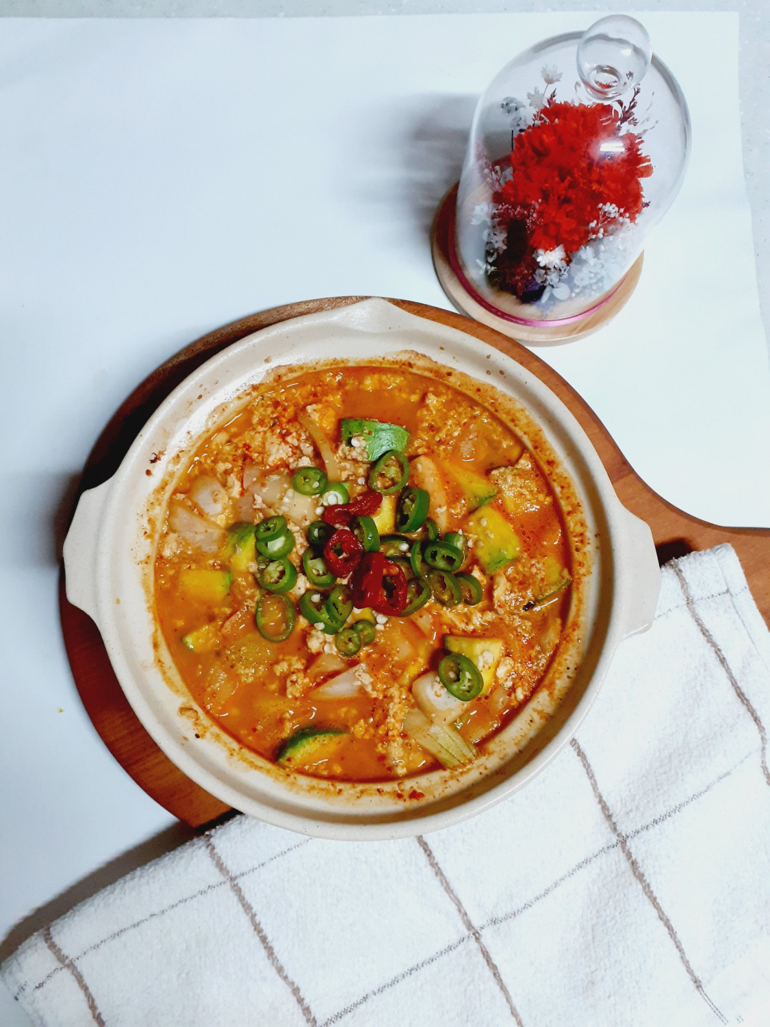 El calabacín cortado en trozos gruesos proporciona una textura satisfactoria, y la combinación de tofu cremoso y doenjang salado y picante crea un guiso tan delicioso que es un verdadero ‘ladrón de arroz’, ¡te hará devorar un plato entero de arroz!