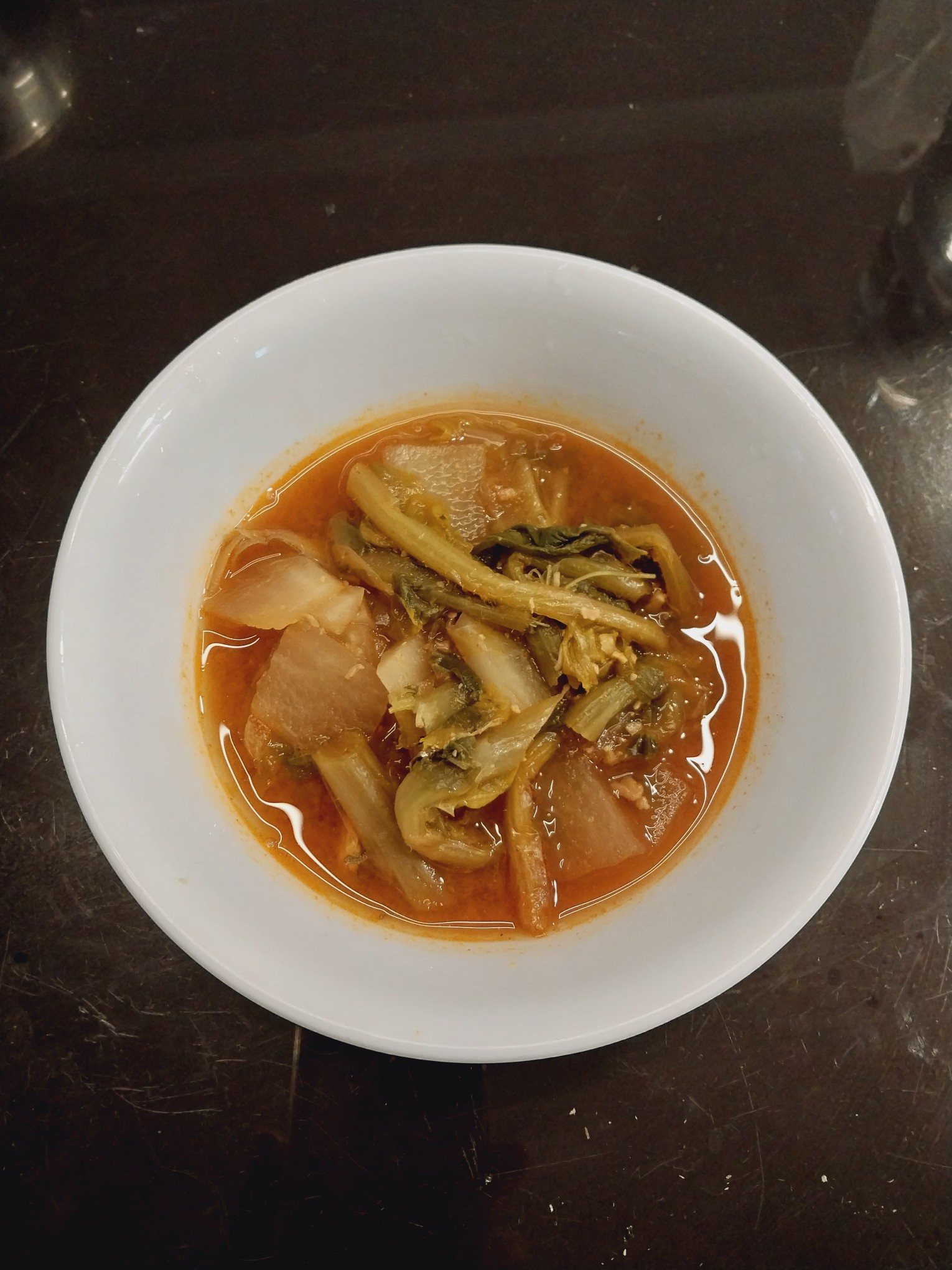 Disfrute de un reconfortante y nutritivo guiso de hojas de rábano secas con pasta de soja. Perfecto para calentar su día.