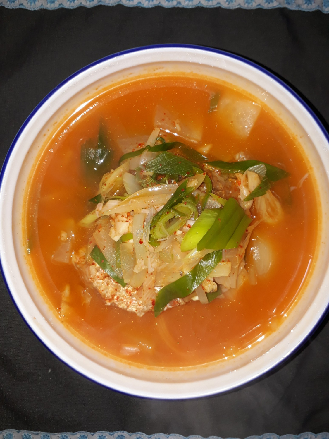 Lleve la mezcla a ebullición a fuego alto. Una vez que hierva, reduzca el fuego a medio y cocine a fuego lento durante unos 10 minutos hasta que el pescado y el rábano estén cocidos. Cuando el pescado esté algo cocido, agregue la cebolla en rodajas, los chiles coreanos y 2 cucharadas de ajo picado. Vuelva a hervir vigorosamente. El caldo se volverá más rico a medida que la cebolla se vuelva translúcida y los ingredientes se mezclen.
