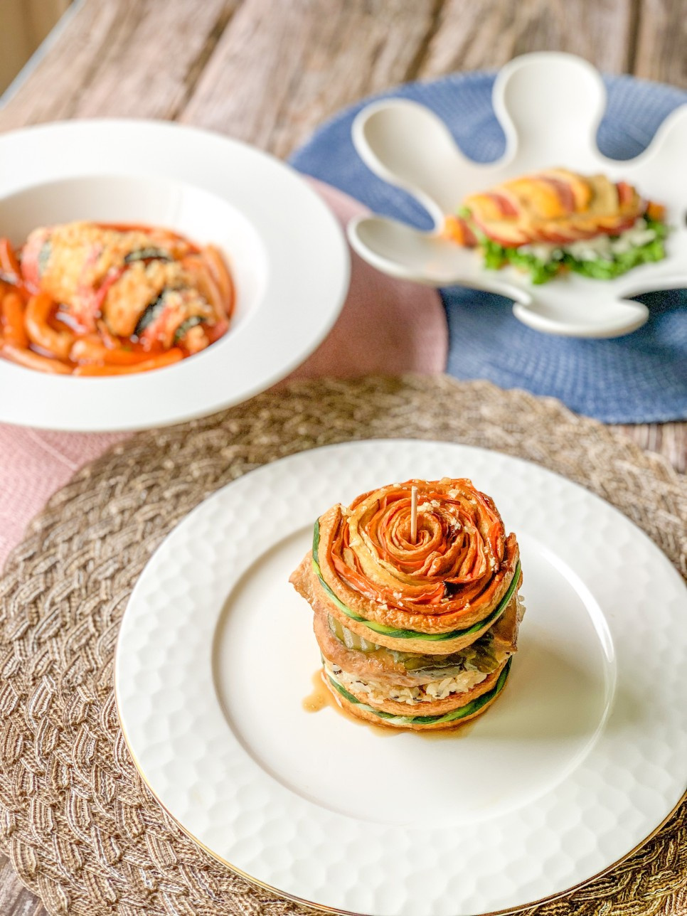 Tome las 12 piezas de pastel de pescado con las verduras y enróllelas suavemente, 6 piezas a la vez, asegurándose de que los ingredientes permanezcan en su lugar. Esto formará una hermosa forma de croissant, parecida a delicados pasteles.