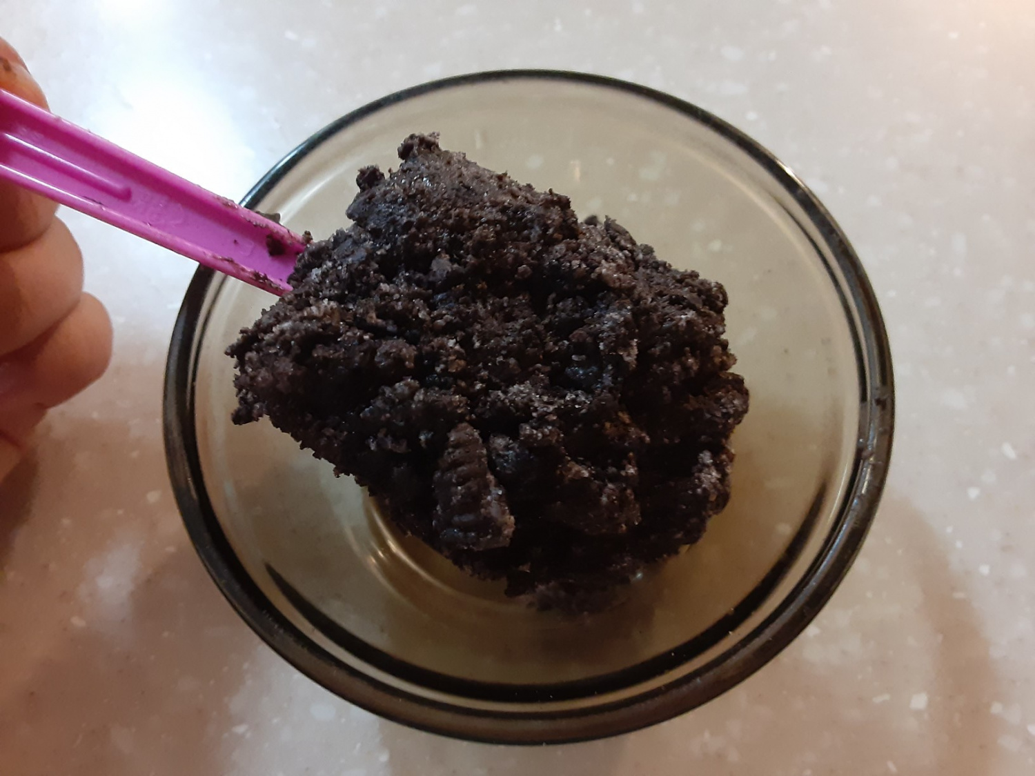 Antes de triturar las galletas, o después, prepare su molde para helado. Yo usé una taza con la parte superior cortada para que pudiera encajar un palito de helado. Coloque cuidadosamente el polvo de Oreo triturado en la taza.