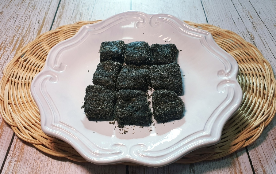 Extiende el sésamo negro finamente molido reservado (para la cobertura) de manera uniforme sobre un plato ancho o bandeja. Coloca los trozos de pastel de arroz cortados sobre el sésamo negro. Haz rodar suavemente los trozos para cubrirlos uniformemente con el polvo. Presionar ligeramente los trozos ayudará a que la cobertura se adhiera mejor.