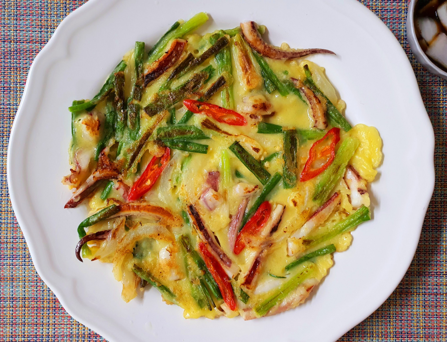 Una vez que ambos lados estén perfectamente cocidos y crujientes, transfiere el jeon de calamares a un plato de servir. Sírvelo inmediatamente con la salsa dip preparada y ¡disfruta! Se disfruta mejor cuando está bien caliente.