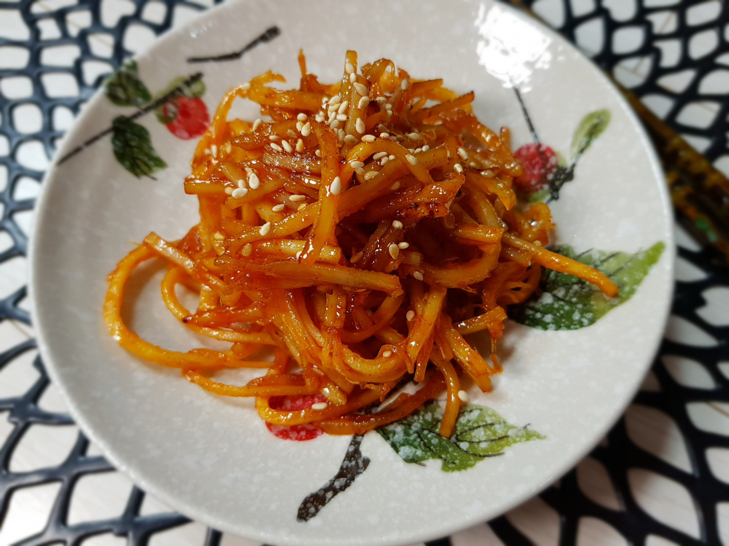 ¡Un plato de acompañamiento que ganó popularidad gracias al Chef Cha Seung-won en ‘Spanish Inn’ de tvN! Prepara este delicioso, dulce y picante jinmi-chae salteado en casa con facilidad. ¡Es un perfecto ‘ladrón de arroz’!