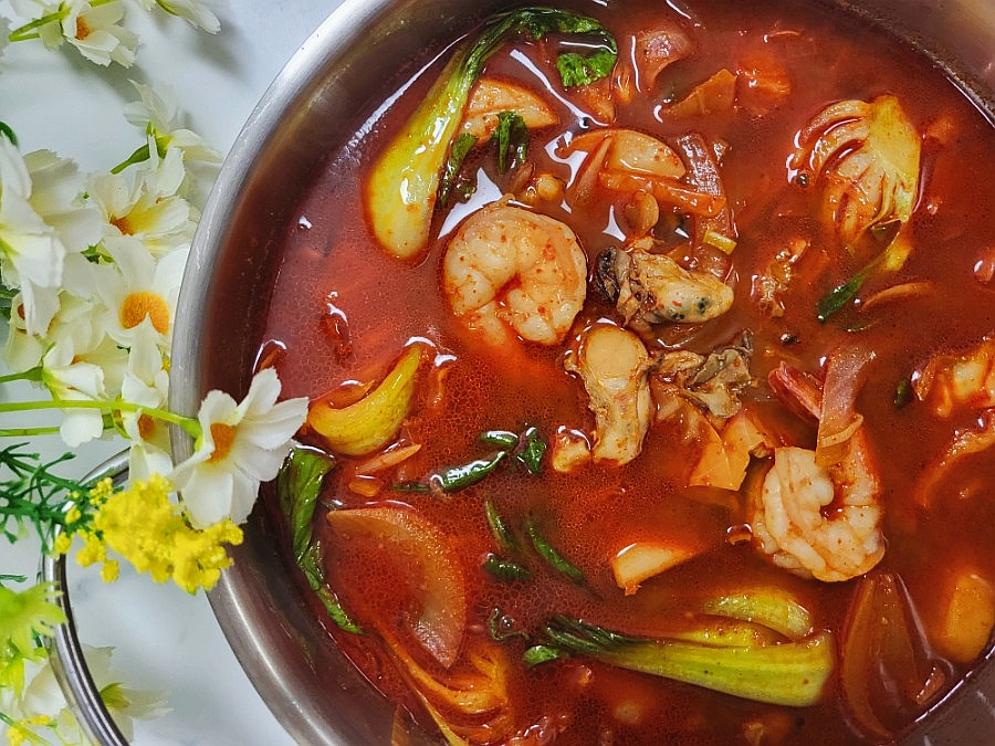 Una Receta Dorada para Jjamppong Picante y Refrescante de Mariscos Hecho con Ostras de Temporada de Tongyeong