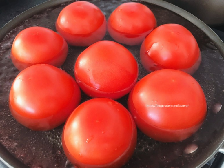 Una vez que el agua esté hirviendo vigorosamente, añade con cuidado los tomates cortados y blanquéalos durante unos 30 segundos.