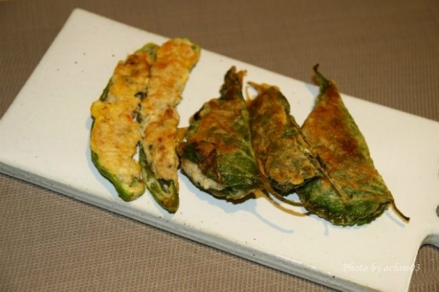 A continuación, prepare el junquillo de pimiento. Retire los tallos de los chiles verdes coreanos y córtelos por la mitad a lo largo. Raspe las semillas, luego cubra ligeramente el interior de cada mitad de pimiento con harina. Rellene las mitades de pimiento con la mezcla de cerdo, extiéndala uniformemente y luego cúbralas con harina y huevo batido en secuencia.