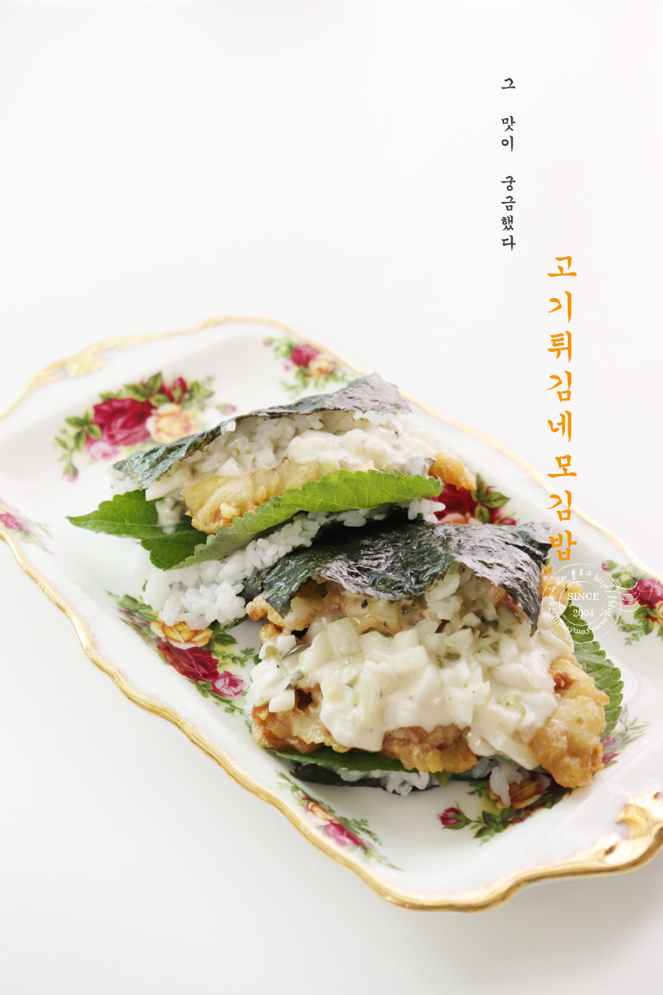 ¡Es hora de armar el kimbap! Coloca una lámina de alga seca con el lado rugoso hacia arriba. Extiende el arroz cocido finamente sobre el alga. Coloca una hoja de shiso sobre el arroz, y luego añade generosamente el cerdo frito crujiente. Rocía la salsa tártara preparada sobre el cerdo. Para un toque para adultos, puedes añadir ajo picado, chile picado o chile encurtido para un toque picante. ¡Seguir el video del kimbap cuadrado de ‘Golmok Sikdang’ hará este proceso aún más fácil. ¡Enróllalo bien apretado y disfrútalo!