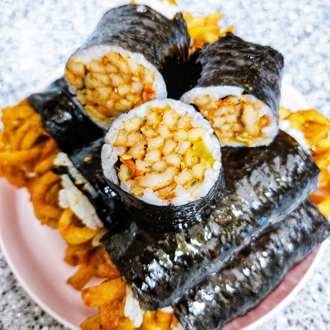 ¡Este es kimbap hecho con un montón de pastel de pescado tierno y dulce salteado! Puedes hacer un kimbap delicioso que a los niños les encanta, incluso solo con pastel de pescado como relleno. ¡Es una comida sencilla recomendada o un menú especial para el lunchbox!