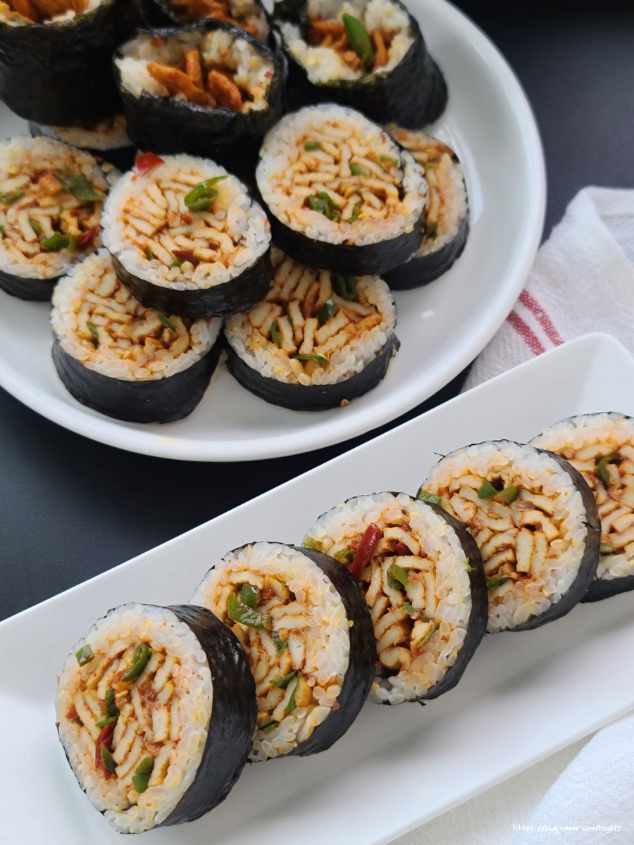 ¿Has visto qué kimbap tan bien relleno de pastel de pescado picante y dulce? Aunque lo hacemos a menudo, es un plato que siempre se me antoja, y solo con ver las fotos se me hace la boca agua. Teníamos rábano encurtido y espinacas blanqueadas en la nevera, pero mi familia y yo preferimos este kimbap simple con solo pastel de pescado. Quizás porque nos encanta el pastel de pescado, podemos apreciar plenamente su sabor realzado por el delicioso aderezo. Es fácil de hacer y tiene un sabor cautivador, ¡así que asegúrate de probarlo!