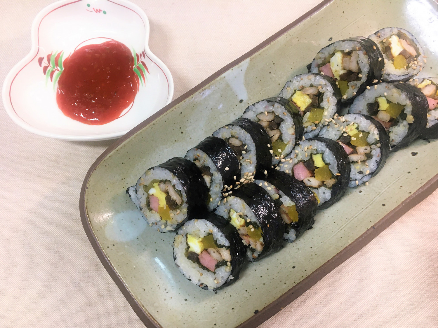¡He preparado kimbap usando los pepinillos de mostaza que hice la semana pasada! Si no tienes pepinillos de mostaza, puedes enjuagar y usar vegetales encurtidos (jangajji) o incluso hojas de mostaza sazonadas (gat kimchi) para crear un kimbap como ningún otro que hayas probado. ¿Sobras de ingredientes de kimbap? ¡Fríelos en forma de tortilla para un delicioso bocadillo! (¡Lo hicimos para el almuerzo y estaba riquísimo!).