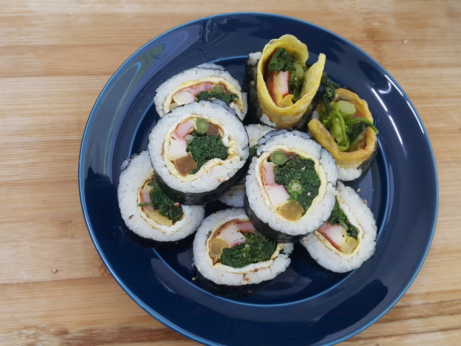 Kimbap Creativo Utilizando Brochetas de Carne Festiva y Verduras Verdes Sobrantes