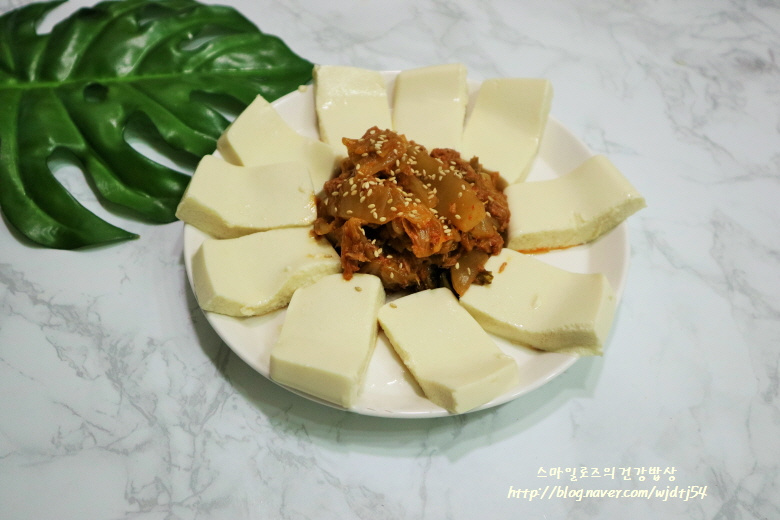 Coloca los bloques de tofu tibio de forma atractiva en un plato para servir. Sirve generosamente el salteado de kimchi añejo con atún preparado en el centro del tofu. Decora con cebolleta picada, chile y pimiento rojo si lo deseas, para una presentación aún más apetitosa.