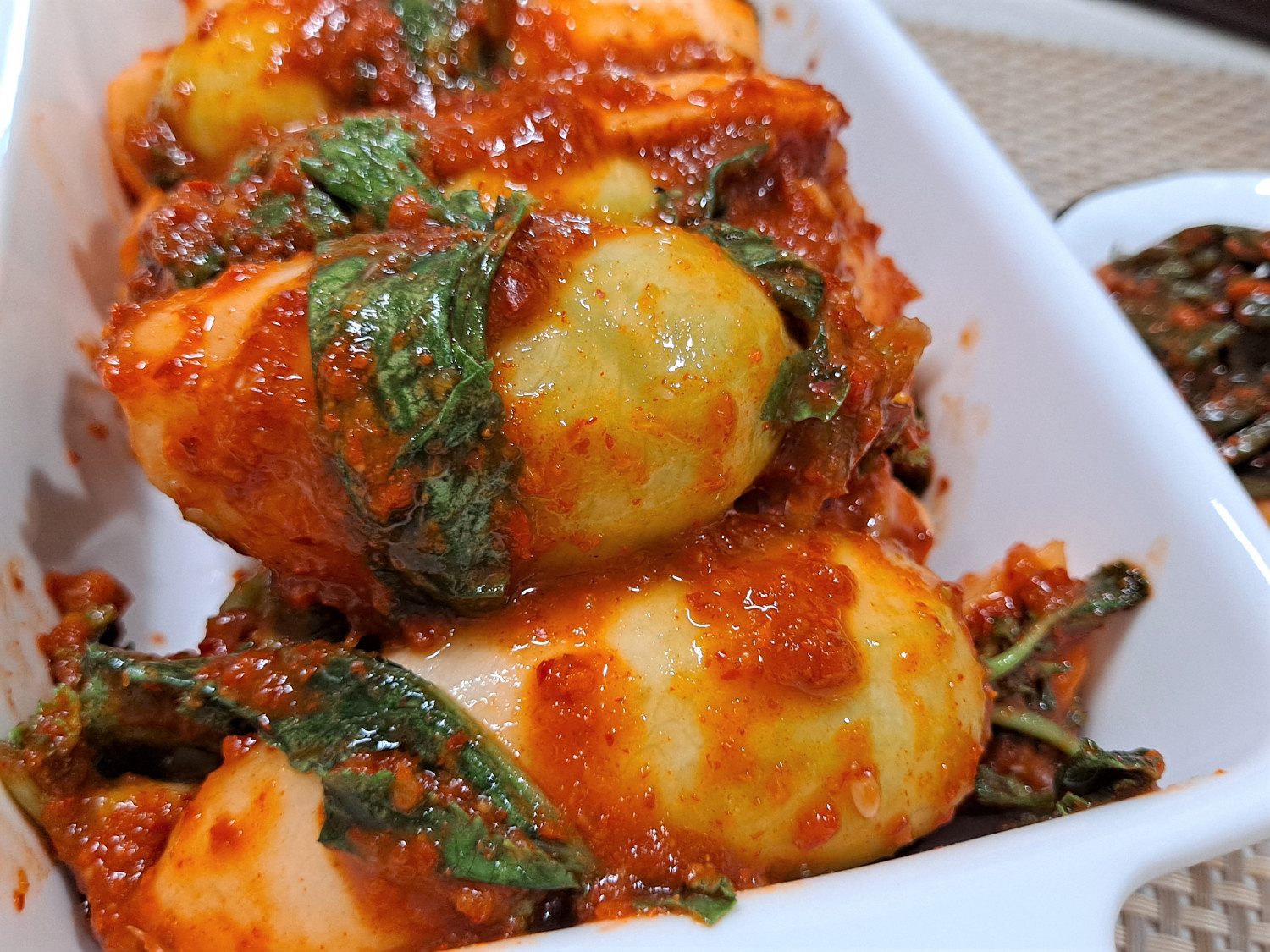 Con la llegada de la temporada de kimchi, hemos preparado Chonggak Kimchi, también conocido como kimchi de rábanos jóvenes, perfecto para disfrutar antes de que madure tu kimchi principal de col china. El crujido refrescante de los rábanos jóvenes combinado con su dulzura natural lo convierten en un delicioso alimento conservado para la temporada, prometiendo una experiencia sabrosa.