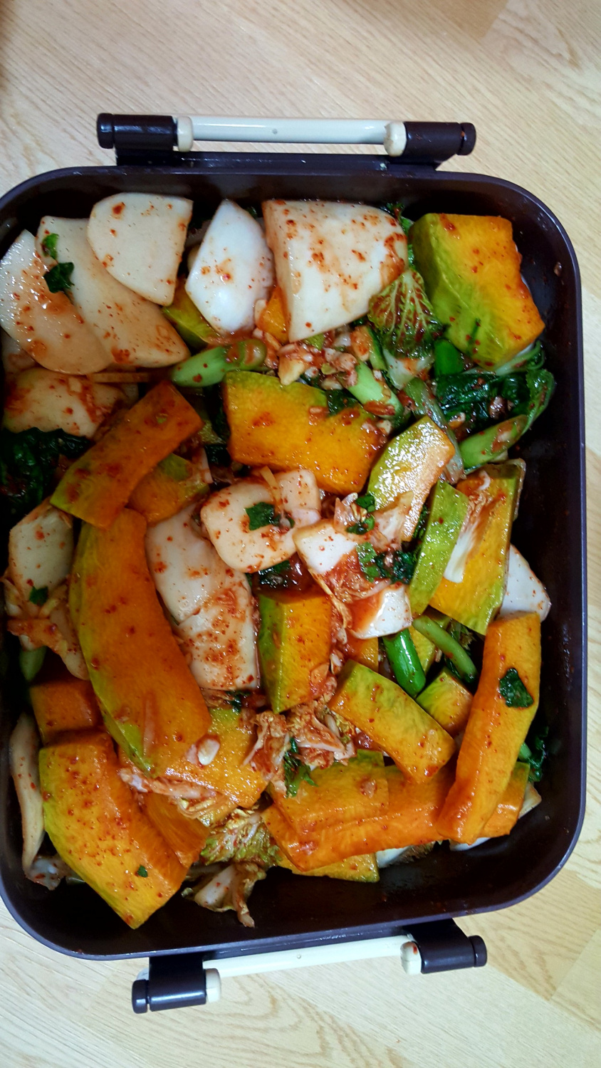 Con los años, los sabores de la infancia, especialmente los de la cocina de mamá, se vuelven cada vez más anhelados. Tenía muchas ganas de probar el kimchi de calabaza vieja, dulce y refrescante, que solía comer. Así que traje una calabaza de mi pueblo y la preparé por primera vez. Una vez que este kimchi fermente, planeo cocinarlo a fuego lento con un poco de agua de arroz para disfrutarlo guisado, ¡tal como se hacía en los viejos tiempos! ^^