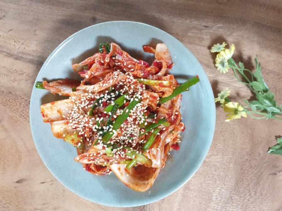 Agrega la pasta de aderezo preparada a la col china escurrida. Añade también las cebolletas cortadas y las semillas de sésamo tostadas. Mezcla todo suavemente con las manos, asegurándote de que el aderezo cubra la col de manera uniforme. Ten cuidado de no mezclar en exceso, ya que esto puede hacer que la col se ablande. Finalmente, prueba el kimchi y ajusta el aderezo añadiendo más sal o salsa de anchoas si es necesario, según tu preferencia. Está delicioso al instante, o puedes enfriarlo en el refrigerador por un tiempo para disfrutar de un sabor más fresco e intenso. ¡Disfruta de tu crujiente, picante y sabroso geotjeori de verano!
